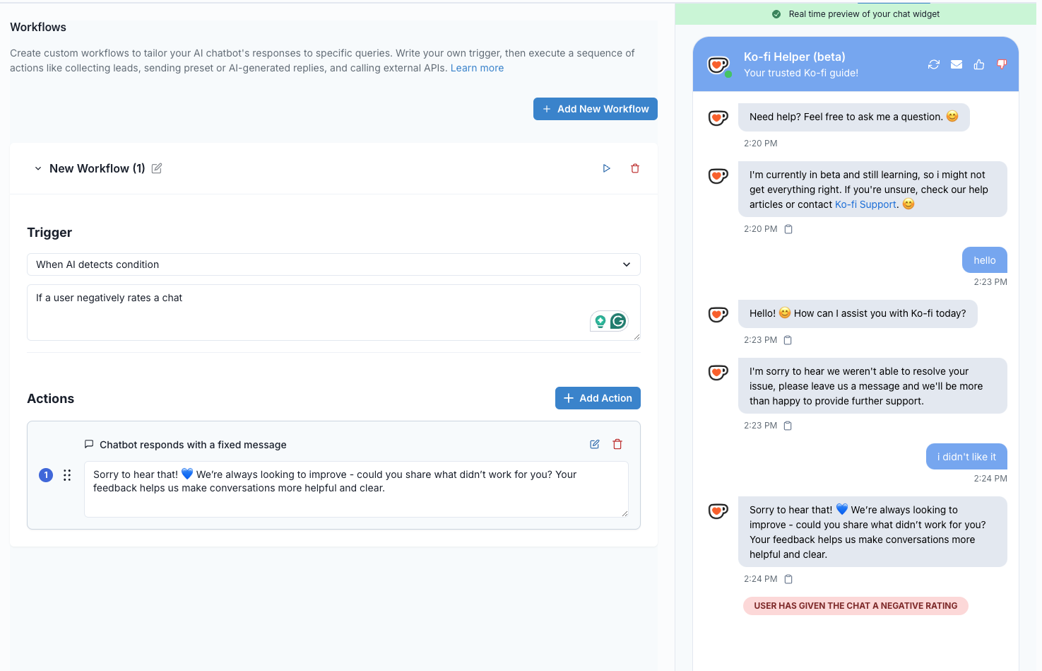 Right now, while you can ask for feedback in the 'bad rating message,' if a user continues typing, the bot tries to continue the conversation instead of treating it as separate feedback.